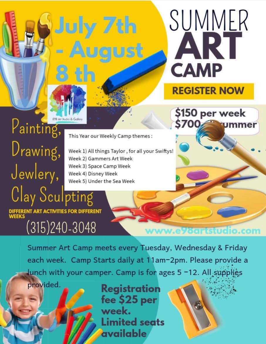 First, E98 runs a summer camp perfect for your little artist. From July 7th to August 8th, on Tuesday, Wednesday, and Friday, the summer art camp runs from 11 AM to 2 PM. You’ll need to pack a lunch for each child. Each week, instructors will teach kids a different style of art.
